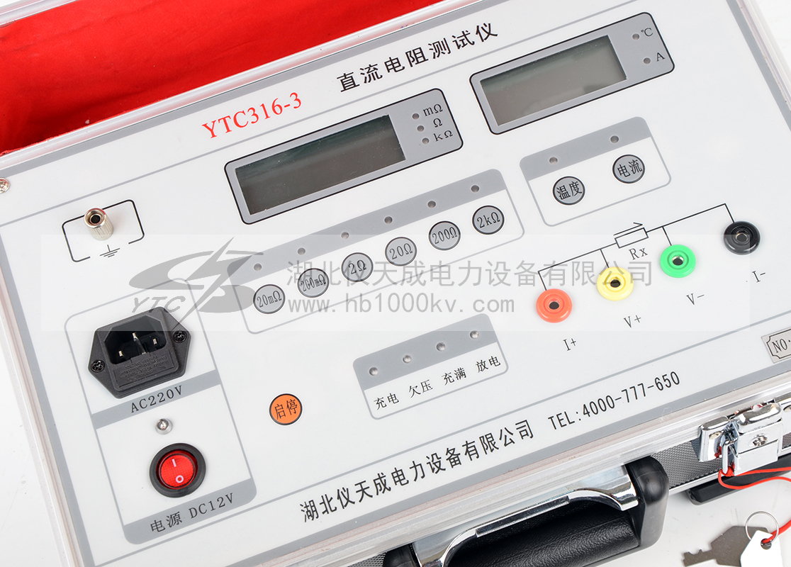 YTC316-3直流電阻測試儀 是取代直流單、雙臂電橋的高精度換代產品。儀器采用了的開關電源技術,其測量速度比電橋快一百多倍,顯示部分由四位半LCD液晶顯示測量結果,三位半LCD液晶顯示環境溫度或測試電流值,克服了其它同類產品由LED顯示值在陽光下不便讀數的缺點,同時具備了自動消弧功能。本儀器具有測速快、精度高、顯示直觀、抗干擾能力強、體積小、耗電省、測試數據穩定可靠、不受人為因素影響等優點。儀器內裝可充電電池組(14.8V),交直流兩用,便于現場及野外測試。