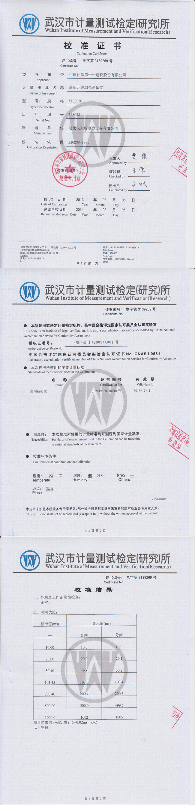 YTC3970高壓開關動特性測試儀鑒定證書