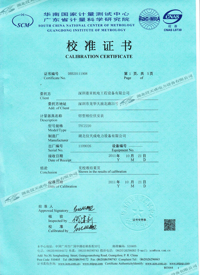 轉載:"YTC2220鉗型相位伏安表的資質證書" 請注明來源于儀天成電力。 更多技術問題請致電儀天成電力客戶服務:027-87876585,技術部專線:027-87876585,在線客服:719388481