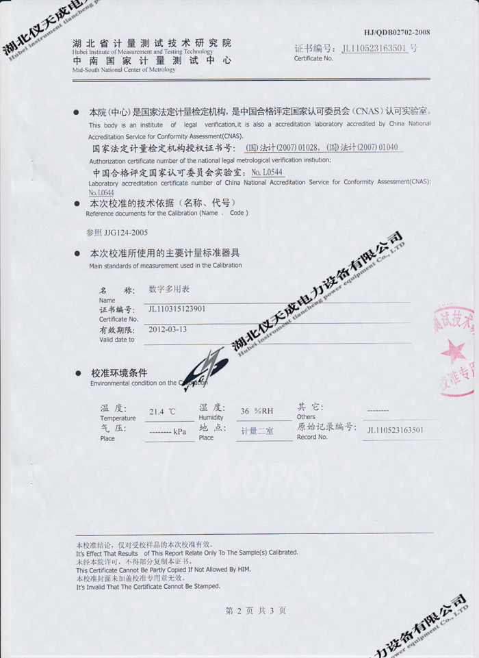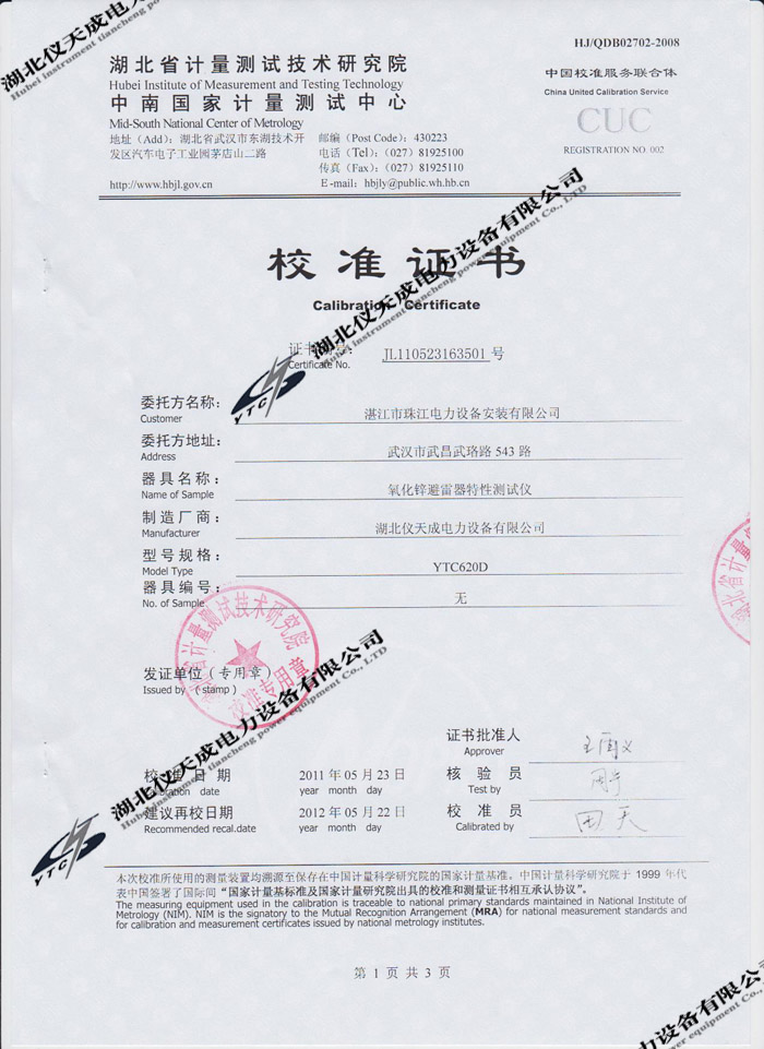 轉(zhuǎn)載:"YTC620D氧化鋅避雷器特性測試儀的資質(zhì)證書" 請注明來源于儀天成電力。 更多技術問題請致電儀天成電力客戶服務:027-87876585,技術部專線:027-87876585,在線客服:719388481