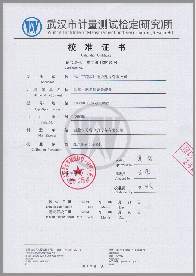 YTC850系列電纜交流耐壓試驗裝置鑒定證書